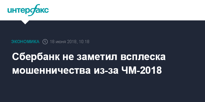 Москва. 18 июня. INTERFAX.RU - Сбербанк России не отмечает роста случаев мошенничества из-за Чемпионата мира по футболу, сообщил зампред правления банка Станислав Кузнецов журналистам в понедельник.