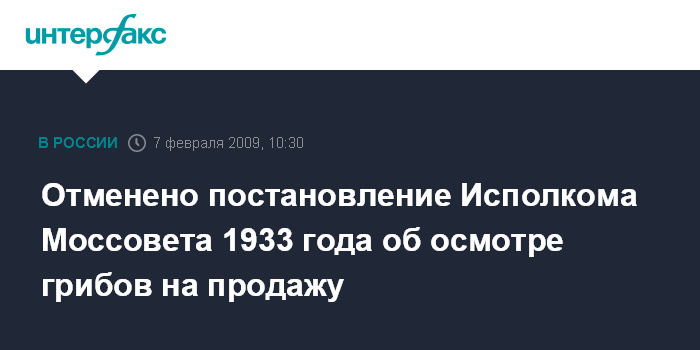 Москва. 7 февраля. INTERFAX.RU - Постановлением правительства Москвы, подписанном мэром города Юрием Лужковым, отменен ряд устаревших нормативных документов, в том числе постановление Исполнительного комитета Моссовета от 1933 года "О санитарном осмотре грибов, поступающих в продажу".