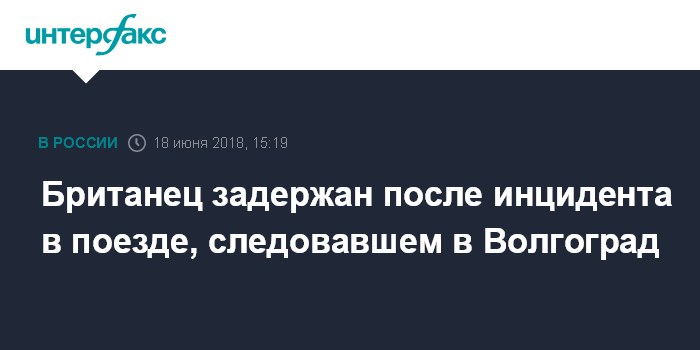 Москва. 18 июня. INTERFAX.RU - Британский подданный задержан в результате инцидента в поезде, следовавшем в Волгоград, сообщили в посольстве Великобритании в России.