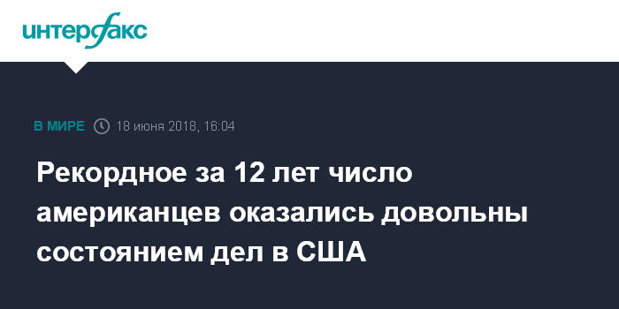 Москва. 18 июня. INTERFAX.RU - Рекордно высокое число американских граждан - 38% - в июне удовлетворены состоянием дел в США и тем, в каком направлении развивается их государство. Об этом свидетельствуют результаты опроса компании Gallup, обнародованные в понедельник.