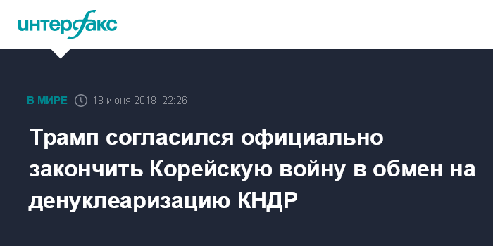 Москва. 18 июня. INTERFAX.RU - Президент США Дональд Трамп согласился "изменить соглашение о перемирии", которое официально положило бы конец Корейской войне, в обмен на денуклеаризацию Северной Кореи, заявил в понедельник американский госсекретарь Майк Помпео.