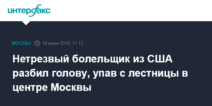 Москва. 19 июня. INTERFAX.RU - Футбольный фанат из США разбил голову, упав с лестницы в нетрезвом состоянии в центре Москвы, сообщил "Интерфаксу" осведомлённый источник.