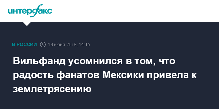 Москва. 19 июня. INTERFAX.RU - Болельщики сборной Мексики не могли вызвать землетрясение, празднуя гол сборной Германии, новости об этом, скорее всего, красивая гипербола, считает научный руководитель Гидрометцентра России Роман Вильфанд.