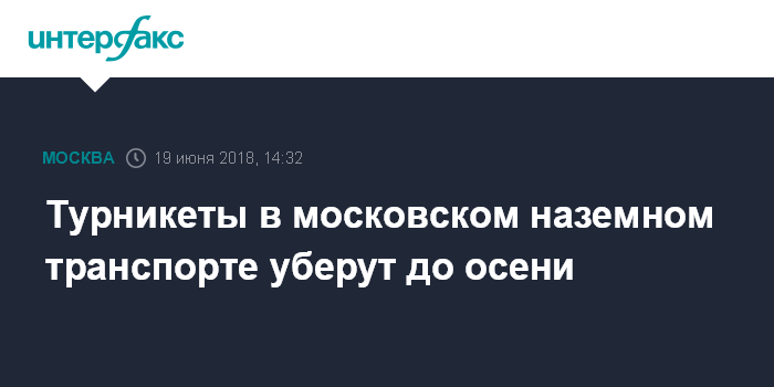 Москва. 19 июня. INTERFAX.RU - Решение об отказе от турникетов во всем наземном общественном транспорте Москвы, принятое президиумом столичного правительства во вторник, вступит в силу не позднее 1 сентября.