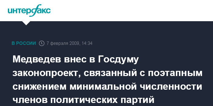 Москва. 7 февраля. INTERFAX.RU - Президент России Дмитрий Медведев в соответствии с пунктом "г" статьи 84 Конституции РФ направил в Государственную Думу проект федерального закона "О внесении изменений в Федеральный закон "О политических партиях" в связи с поэтапным снижением минимальной численности членов политических партий". Об этом сообщила в субботу пресс-служба главы государства.