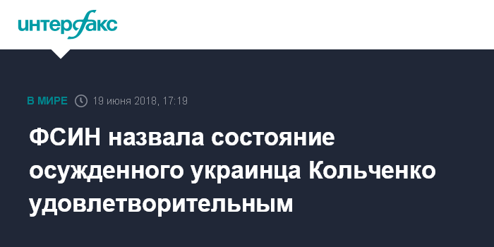 Москва. 19 июня. INTERFAX.RU - Состояние здоровья отбывающего наказание в России украинца Александра Кольченко не вызывает опасений, заявили в пресс-бюро управления ФСИН по Челябинской области.