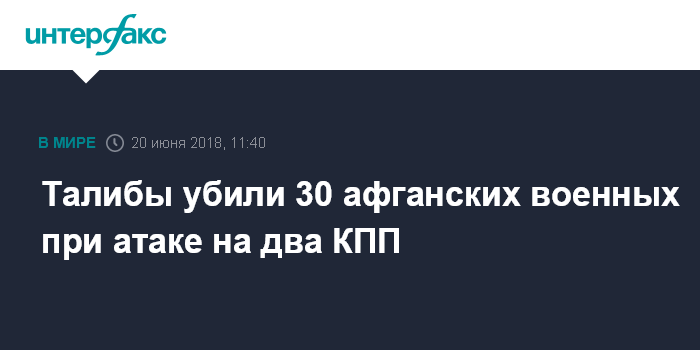 Москва. 20 июня. INTERFAX.RU - Нападение мятежников из движения "Талибан" (запрещено в РФ) на два КПП на территории граничащей с Туркменией афганской провинции Бадгис привели к гибели не менее 30 бойцов армии Афганистана, передает в среду агентство Associated Press.