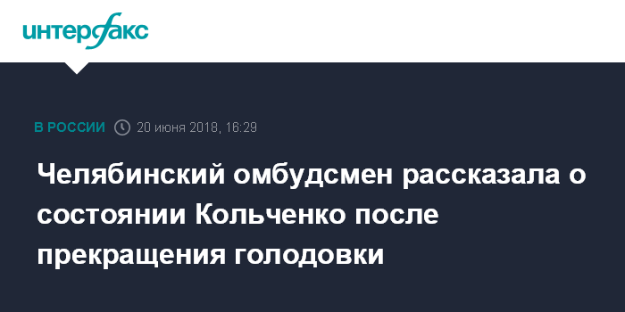 Москва. 20 июня. INTERFAX.RU - Находящийся в российской колонии гражданин Украины Александр Кольченко остается под наблюдением в медсанчасти после того, как 7 июня прекратил голодовку, сообщили в пресс-службе уполномоченного по правам человека в Челябинской области Маргариты Павловой, накануне посетившей заключенного в колонии.