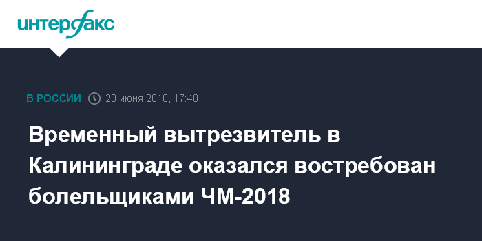 Москва. 20 июня. INTERFAX.RU - Создание в Калининграде временного вытрезвителя для футбольных болельщиков полностью себя оправдало, сообщил министр здравоохранения региона Александр Кравченко журналистам во вторник.