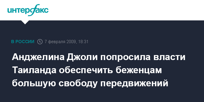 Москва. 7 февраля. INTERFAX.RU - Известная американская киноактриса, обладательница "Оскара" Анджелина Джоли обратилась к властям Таиланда с призывом дать большую свободу действий тысячам беженцев из Мьянмы, осевшим на таиландской территории.