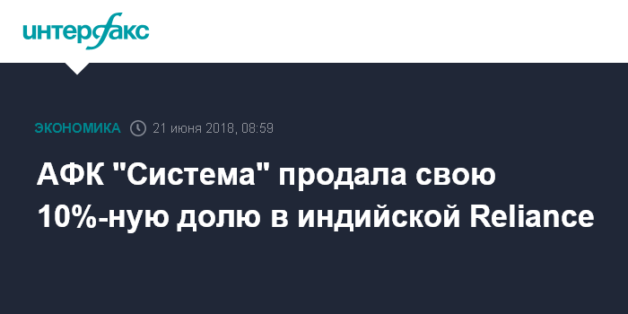 Москва. 21 июня. INTERFAX.RU - АФК "Система" полностью продала свой 10%-ный пакет акций в индийской телекоммуникационной Reliance Communications Ltd (RCom), сообщает индийская Economic Times.