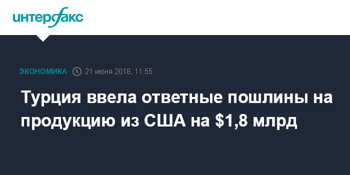 Москва. 21 июня. INTERFAX.RU - Турция вводит заградительные пошлины на импорт почти двух десятков видов товаров из США - от автомобилей до солнцезащитных кремов, в ответ на пошлины Вашингтона на сталь и алюминий, сообщает в четверг агентство Associated Press.