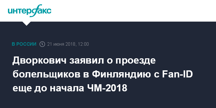 Отвечая на вопрос "Интерфакса", как болельщики могли попасть в Финляндию, если Fan-ID дает право безвизового въезда только в Россию, Дворкович сказал: "Это вопрос к финнам".