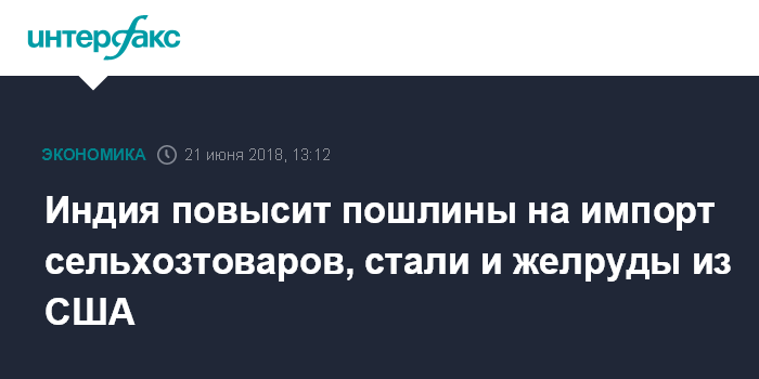 Москва. 21 июня. INTERFAX.RU - Индия повышает пошлины на импорт некоторых сельскохозяйственных товаров, стали и железной руды из США в качестве ответных мер на введение Вашингтоном дополнительных тарифов на импорт стали и алюминия.
