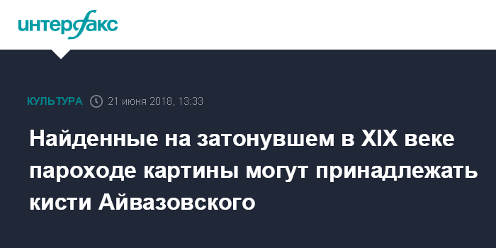Москва. 21 июня. INTERFAX.RU - Более 10 полотен, среди которых, возможно, есть работы известного мариниста Ивана Айвазовского, обнаружены на пароходе "Генерал Коцебу", затонувшем в XIX веке в районе мыса Тарханкут у западного побережья Крыма.