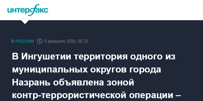 Назрань. 8 февраля. ИНТЕРФАКС-ЮГ - Территория муниципального округа Насэр-Корт города Назрань объявлена зоной проведения контр-террористической операции, сообщили агентству "Интерфакс-Юг" в пресс-службе УФСБ по Ингушетиии.