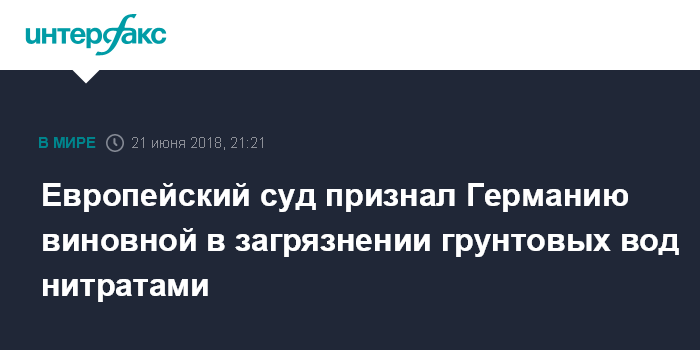 Москва. 21 июня. INTERFAX.RU - Европейский суд признал Германию виновной в нарушении законодательства Европейского союза в связи с высоким загрязнением грунтовых вод нитратами.