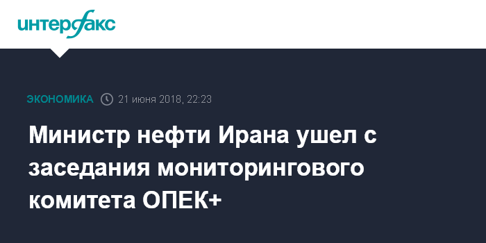 Москва. 21 июня. INTERFAX.RU - Приглашенный на министерский мониторинговый комитет ОПЕК+ министр нефти Ирана Бижан Намдар Зангане покинул заседание после начала обсуждения ситуации вокруг сделки в закрытом режиме, передал в четверг корреспондент "Интерфакса" с места событий. По словам Зангане, переговоры на комитете идут "не очень хорошо", сообщает Financial Times.