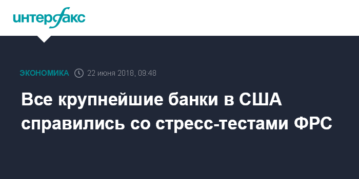Москва. 22 июня. INTERFAX.RU - Все крупнейшие банки, работающие в США, выполнили минимальные требования Федеральной резервной системы (ФРС) к капиталу в рамках первого раунда ежегодных стресс-тестов - проверок согласно закону о финансовой реформе Додда-Фрэнка (DFAST).
