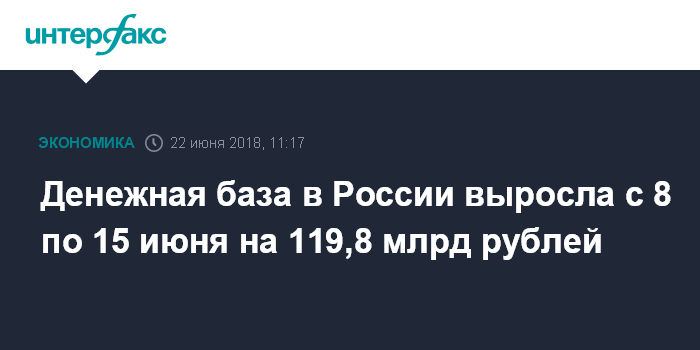 На 8 июня денежная база в России равнялась 10062,4 млрд рублей. Таким образом, за период она выросла на 1,19%, или на 119,8 млрд рублей.