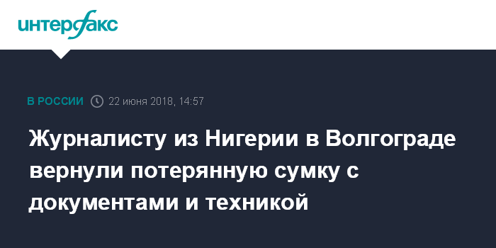 Москва. 22 июня. INTERFAX.RU - Жители Волгограда нашли потерянную журналистом из Нигерии Ннамди Обанией сумку и через полицейских вернули ее владельцу, сообщили агентству "Интерфакс" в администрации региона.