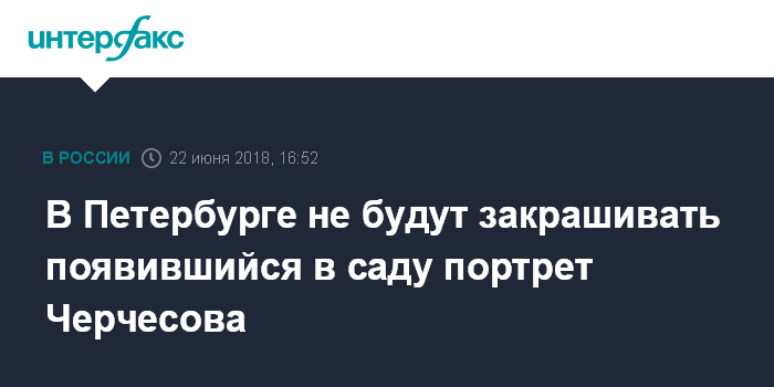 Москва. 22 июня. INTERFAX.RU - Власти Санкт-Петербурга не намерены закрашивать портрет главного тренера сборной России о футболу на ЧМ-2018 Станислава Черчесова, появившийся накануне на одной из трансформаторной подстанции в Пушкарском саду.