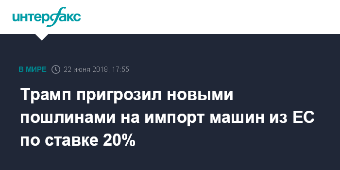 "Исходя из пошлин и торговых ограничений, которые Евросоюз долгое время применял против США и их великих компаний и работников, и если такие пошлины и ограничения не будут отменены и ликвидированы в ближайшее время, мы введем пошлину в размере 20% на все их (ЕС - ИФ) автомобили, импортируемые в США", - написал американский президент в твиттере. "Стройте их (автомобили) здесь!" - добавил он.
