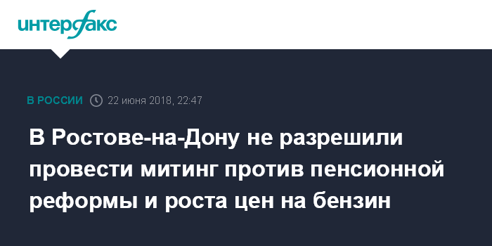 Москва. 22 июня. INTERFAX.RU - Администрация Ростова-на-Дону отказала в проведении митинга против повышения пенсионного возраста и роста цен на бензин 1 июля, предложив перенести мероприятие на другую дату, сообщает пресс-служба ростовского областного отделения КПРФ, выступившей организатором митинга.