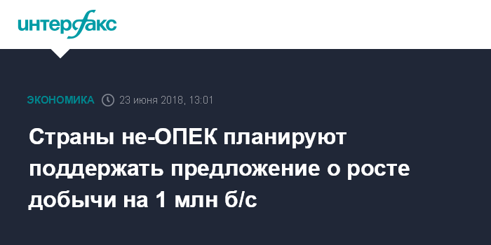 Москва. 23 июня. INTERFAX.RU - Страны не-ОПЕК, участвующие в соглашении об ограничении добычи нефти, планируют на заседании в субботу поддержать решение ОПЕК о повышении добычи нефти на 1 млн баррелей в сутки, сообщило агентство Bloomberg со ссылкой на участков заседания.