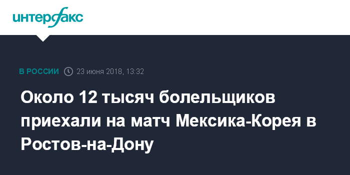 Москва. 23 июня. INTERFAX.RU - Около 12 тысяч иностранных болельщиков приехали в Ростов-на-Дону на матч Мексика - Корея, который состоится 23 июня на стадионе "Ростов-Арена", сообщает пресс-служба губернатора Ростовской области.