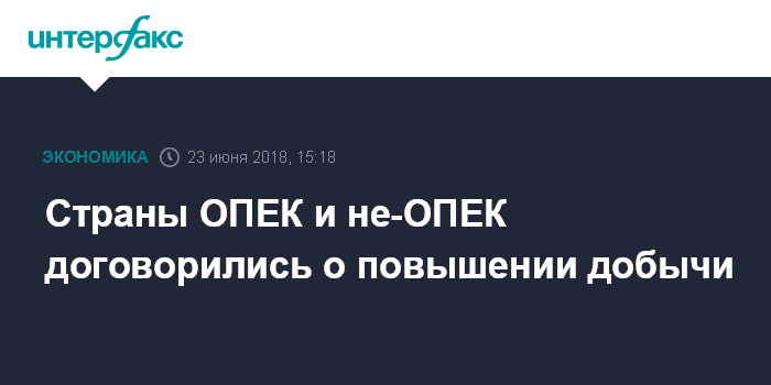Москва. 23 июня. INTERFAX.RU - Страны ОПЕК и не-ОПЕК договорились о повышении добычи нефти до уровней 100% исполнения своих обязательств по сделке о сокращении добычи нефти, сообщило агентство Bloomberg со ссылкой на участников встречи.