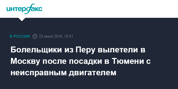 Москва. 23 июня. INTERFAX.RU - Перуанские болельщики, прилетевшие в Тюмень на самолете, который приземлился с неисправным двигателем, отправлены в Москву.