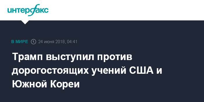 Москва. 24 июня. INTERFAX.RU - Президент США Дональд Трамп выступает против военных учений США и Южной Кореи, так как они "обходятся в целое состояние".