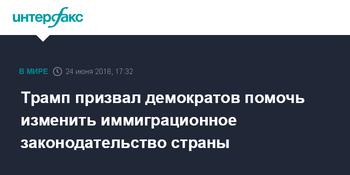Москва. 24 июня. INTERFAX.RU - Президент США Дональд Трамп призвал Демократическую партию не самоустраняться от работы по изменению американского иммиграционного законодательства.