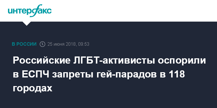 Москва. 25 июня. INTERFAX.RU - Анапа стала 118-м городом России, запреты публичных ЛГБТ-акций в котором оспорены в Европейском суде по правам человека, написал в понедельник лидер российского гей-движения Николай Алексеев в фейсбуке.