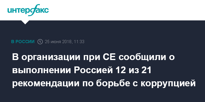 Москва. 25 июня. INTERFAX.RU - Россия "удовлетворительным образом" выполнила 12 из 21 рекомендаций Группы государств по борьбе с коррупцией (GRECO) при Совете Европы, говорится в пресс-релизе GRECO.