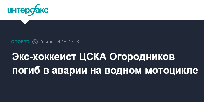 Москва. 25 июня. INTERFAX.RU - Бывший игрок ряда клубов Континентальной хоккейной лиги (КХЛ) Сергей Огородников погиб в результате аварии на водном мотоцикле на 33-м году жизни.