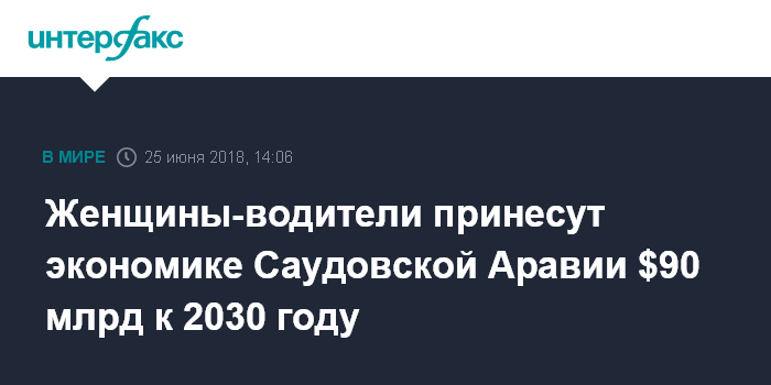 Москва. 25 июня. INTERFAX.RU - Решение правительства Саудовской Аравии об отмене запрета на вождение автомобиля женщинами положительно скажется на темпах экономического роста, добавив к ВВП страны в общей сложности $90 млрд к 2030 году, пишет агентство Bloomberg.