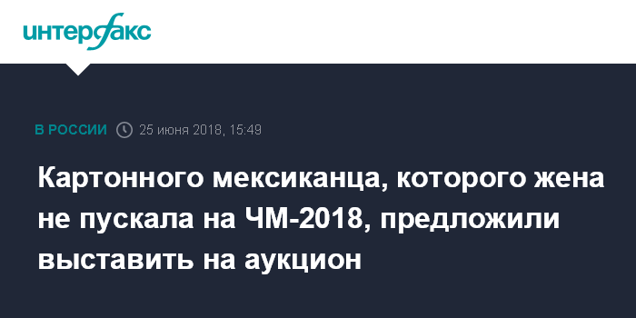 Москва. 25 июня. INTERFAX.RU - Фигура мексиканского болельщика Хавьера из картона, ставшая мемом чемпионата мира по футболу 2018 года, может быть выставлена на аукцион, средства от него пойдут на благотворительность, сообщила представитель турнира Виктория Лопырева.
