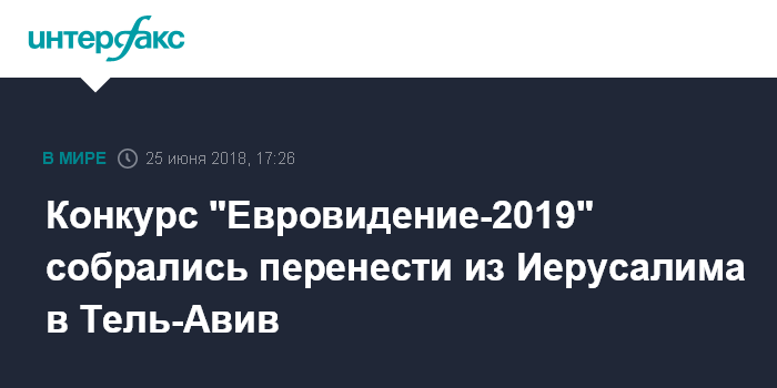 Москва. 25 июня. INTERFAX.RU - Конкурс песен Евровидение-2019 может пройти в Тель-Авиве, а не в Иерусалиме, как это планировалось ранее, "из-за политической обстановки и непринятия палестинцами Иерусалима, как столицы Израиля", передает израильский телеканал i24news.tv.