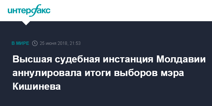 Москва. 25 июня. INTERFAX.RU - Высшая судебная палата (ВСП) Молдавии аннулировала результаты выборов мэра Кишинева.