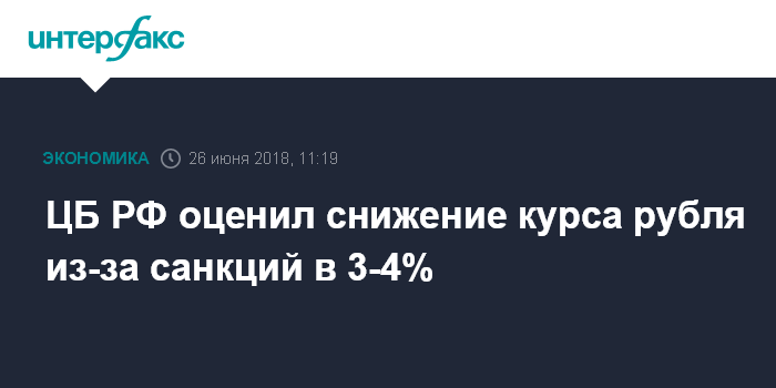 Москва. 26 июня. INTERFAX.RU - Курс рубля без апрельских санкций в отношении России был бы выше на 3-4%, говорится в комментарии ЦБ РФ по ликвидности и финансовым рынкам.