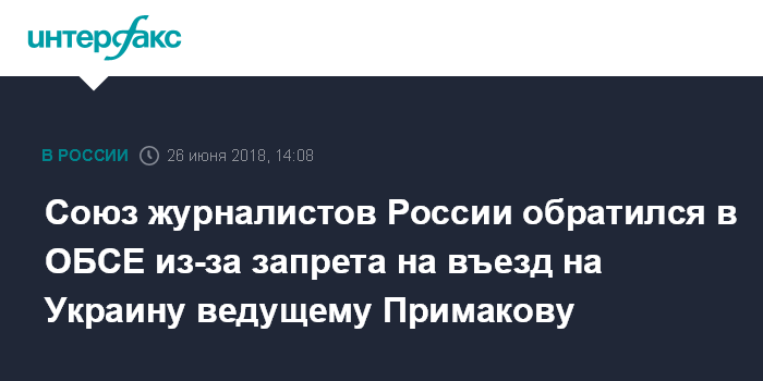 В заявлении уточняется, что секретарю СЖР Примакову объявили о запрете на въезд в страну в аэропорту Борисполя, куда он прилетел из Москвы на экспертную конференцию "Укрепление свободы СМИ и плюрализма в Украине во время конфликтов в стране и вокруг нее", организованную ОБСЕ.