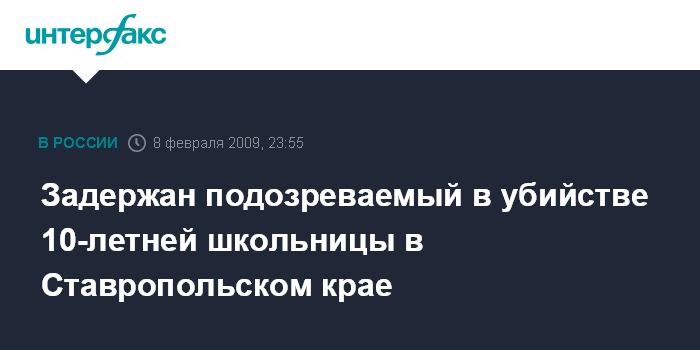 Москва. 8 февраля. ИНТЕРФАКС - В Ставропольском крае задержан подозреваемый в совершении жестокого убийства 10-летней школьницы