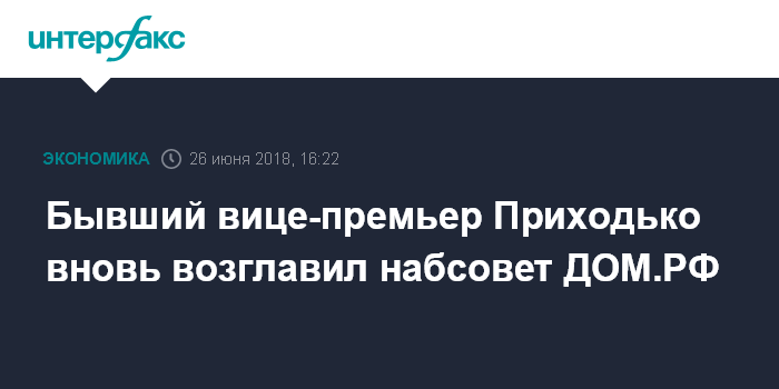 Москва. 26 июня. INTERFAX.RU - Председателем наблюдательного совета "ДОМ.РФ" (бывшее "АИЖК") вновь стал Сергей Приходько, который в настоящее время является первым замглавы аппарата правительства РФ.