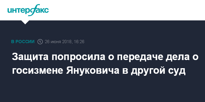 Москва. 26 июня. INTERFAX.RU - Защита обвиняемого в государственной измене экс-президента Украины Виктора Януковича ходатайствует о передаче его дела из Оболонского райсуда Киева в любой другой суд.