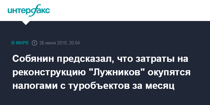 Москва. 26 июня. INTERFAX.RU - Расходы на реконструкцию стадиона "Лужники" могут окупиться дополнительными налогами с туристических объектов за один месяц, заявил мэр Москвы Сергей Собянин.