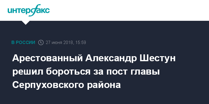 Москва. 27 июня. INTERFAX.RU - Находящийся под арестом глава Серпуховского района Московской области Александр Шестун будет баллотироваться на пост руководителя района, сообщила его супруга Юлия Шестун.