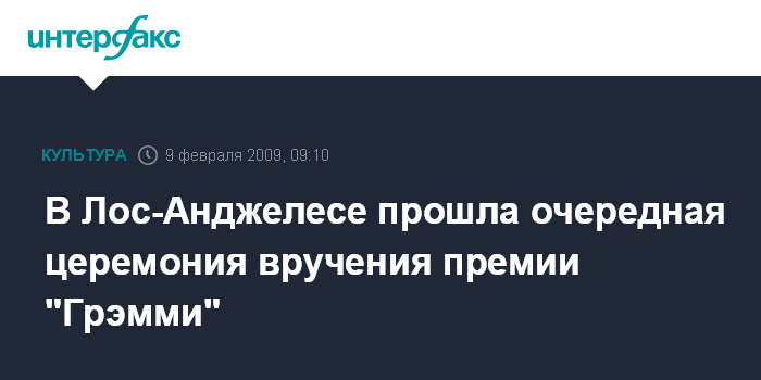 Москва. 9 февраля. INTERFAX.RU - Ежегодная церемония вручения музыкальной премии "Грэмми" состоялась в ночь на понедельник в Лос-Анджелесе.