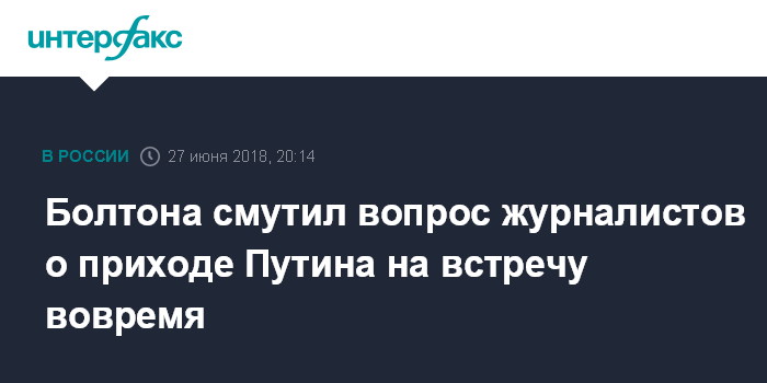 "Это самый сложный вопрос, который мне пока задали здесь сегодня. Я могу либо согласиться с вами и сказать, что он (Владимир Путин) действительно пришел вовремя. Или я могу вам сказать, во сколько он пришел на встречу, и тогда я буду виноват в том, что назову его (Путина) опоздавшим", - отшутился Болтон.